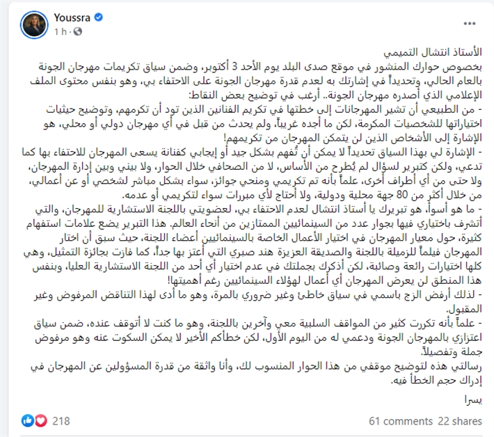 وقالت يسرا في منشورها: “الأستاذ انتشال التميمي، بخصوص حوارك المنشور في موقع داخل مصر يوم الأحد 3 أكتوبر، وضمن سياق تكريمات مهرجان الجونة بالعام الحالي، وتحديداً في إشارتك به لعدم قدرة مهرجان الجونة على الاحتفاء بي، وهو بنفس محتوى الملف الإعلامي الذي أصدره مهرجان الجونة.. أرغب في توضيح بعض النقاط: